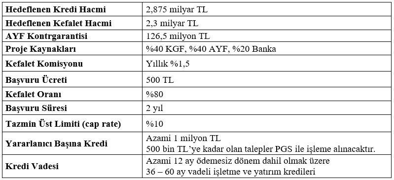 - Proje kaynakları: %75 AYF kontrgarantisi, %25 KGF özkaynağı